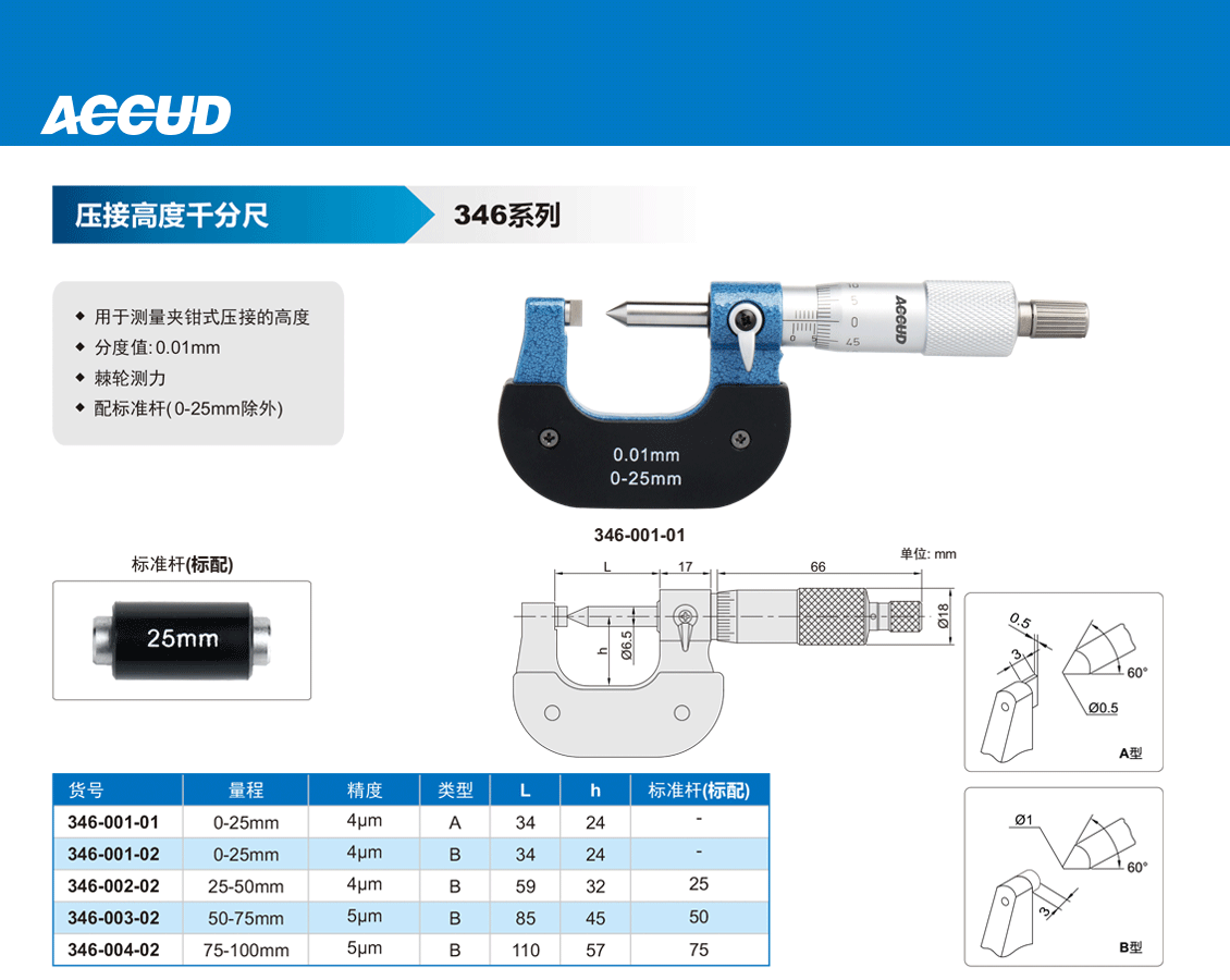 簡(jiǎn)短描述: ? 符合JJG外徑千分尺國(guó)家計(jì)量檢定規(guī)程 ? 用于測(cè)量夾鉗式壓接的高度 ? 分度值: 0.01mm ? 棘輪測(cè)力 ? 配標(biāo)準(zhǔn)桿( 0-25mm除外)