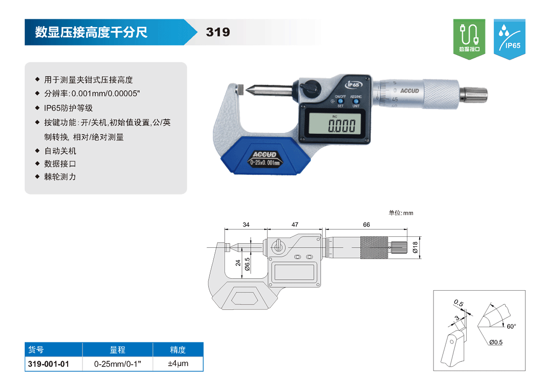 ? 分辨率: 0.001mm/0.00005"