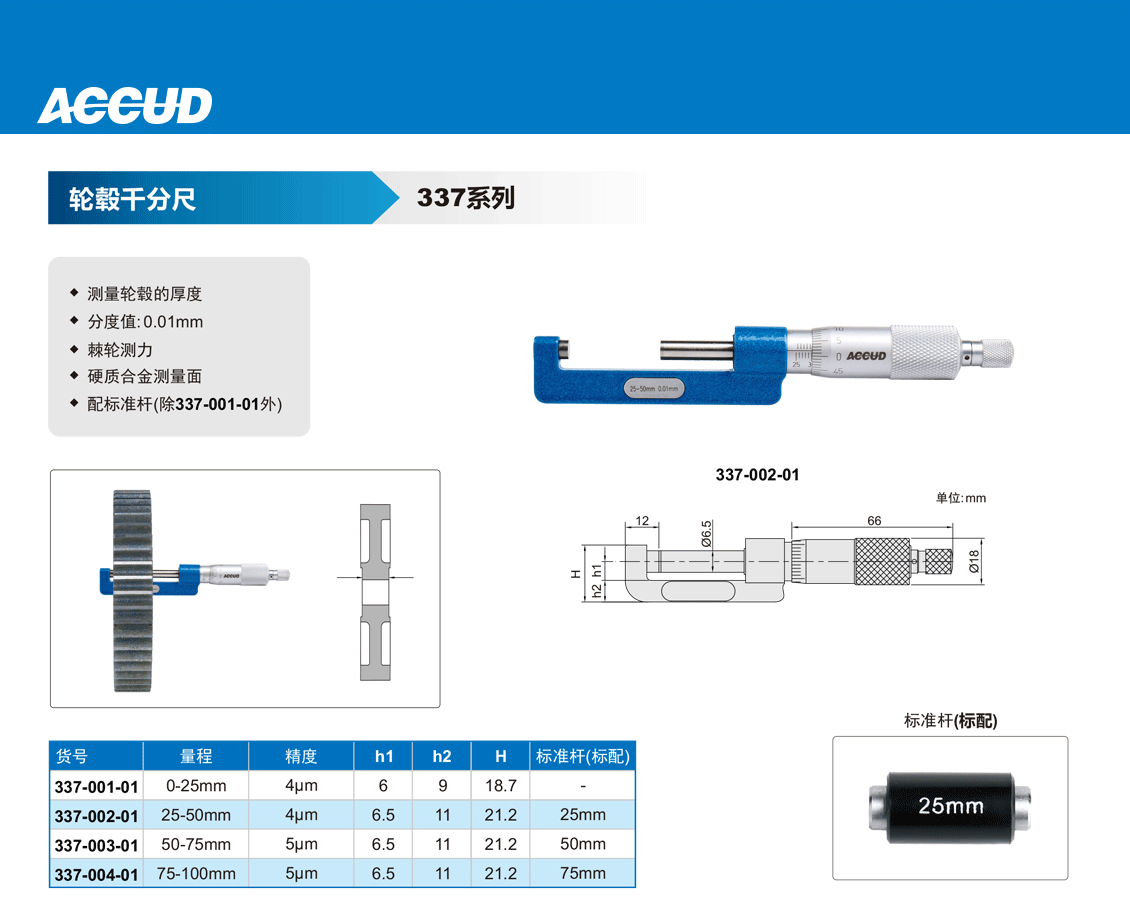 簡(jiǎn)短描述: ? 符合JJG外徑千分尺國(guó)家計(jì)量檢定規(guī)程 ? 測(cè)量輪轂的厚度 ? 分度值: 0.01mm ? 棘輪測(cè)力 ? 硬質(zhì)合金測(cè)量面 ? 配標(biāo)準(zhǔn)桿(除337-001-01外)