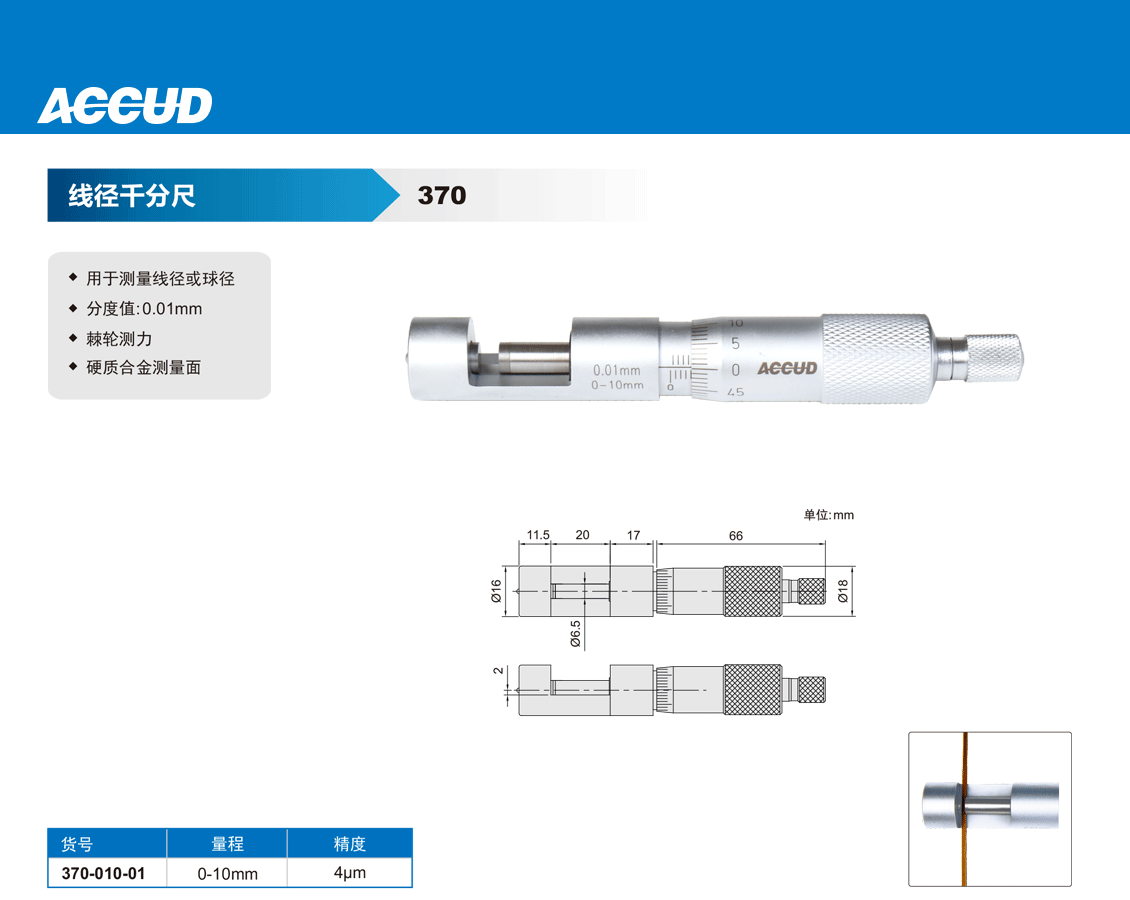 簡短描述: ? 符合JJG外徑千分尺國家計量檢定規(guī)程 ? 用于測量線徑或球徑 ? 分度值: 0.01mm ? 棘輪測力 ? 硬質(zhì)合金測量面