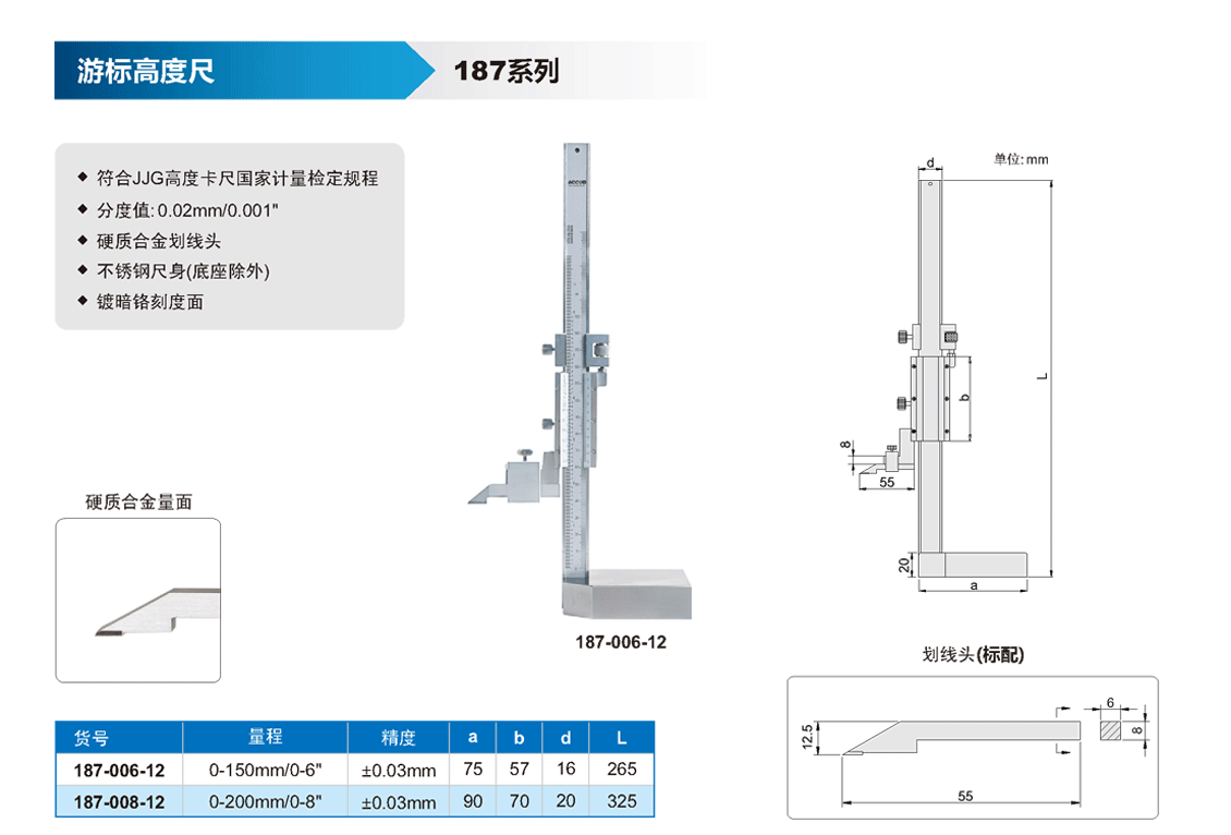 簡(jiǎn)短描述: ? 符合JJG高度卡尺國(guó)家計(jì)量檢定規(guī)程 ? 分度值: 0.02mm/0.001" ? 硬質(zhì)合金劃線頭 ? 不銹鋼尺身(底座除外) ? 鍍暗鉻刻度面