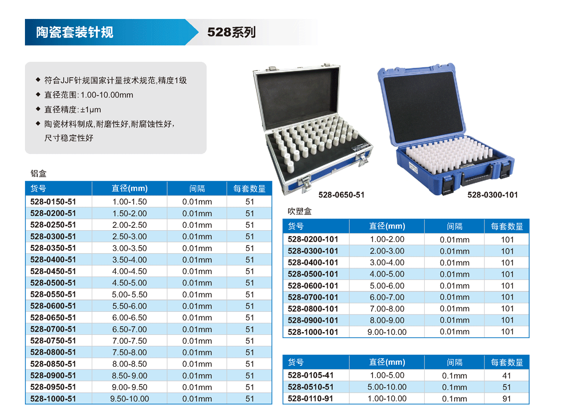 簡短描述: ? 符合JJF針規(guī)國家計量技術規(guī)范,精度1級 ? 直徑范圍: 1.00-10.00mm ? 直徑精度: ±1μm ? 陶瓷材料制成,耐磨性好,耐腐蝕性好, 尺寸穩(wěn)定性好