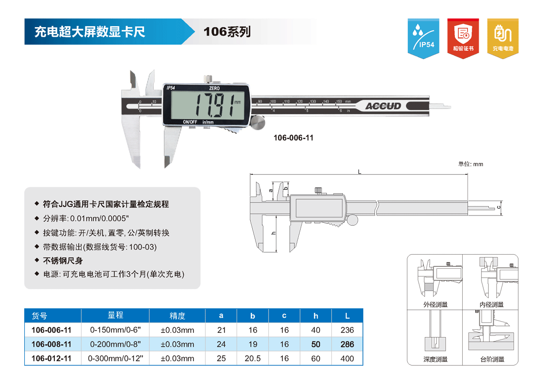 簡短描述: ? 符合JJG通用卡尺國家計量檢定規(guī)程 ? 分辨率: 0.01mm/0.0005" ? 按鍵功能: 開/關(guān)機, 置零, 公/英制轉(zhuǎn)換 ? 帶數(shù)據(jù)輸出(數(shù)據(jù)線貨號: 100-03) ? 不銹鋼尺身 ? 電源: 可充電電池 可工作3個月(單次充電)