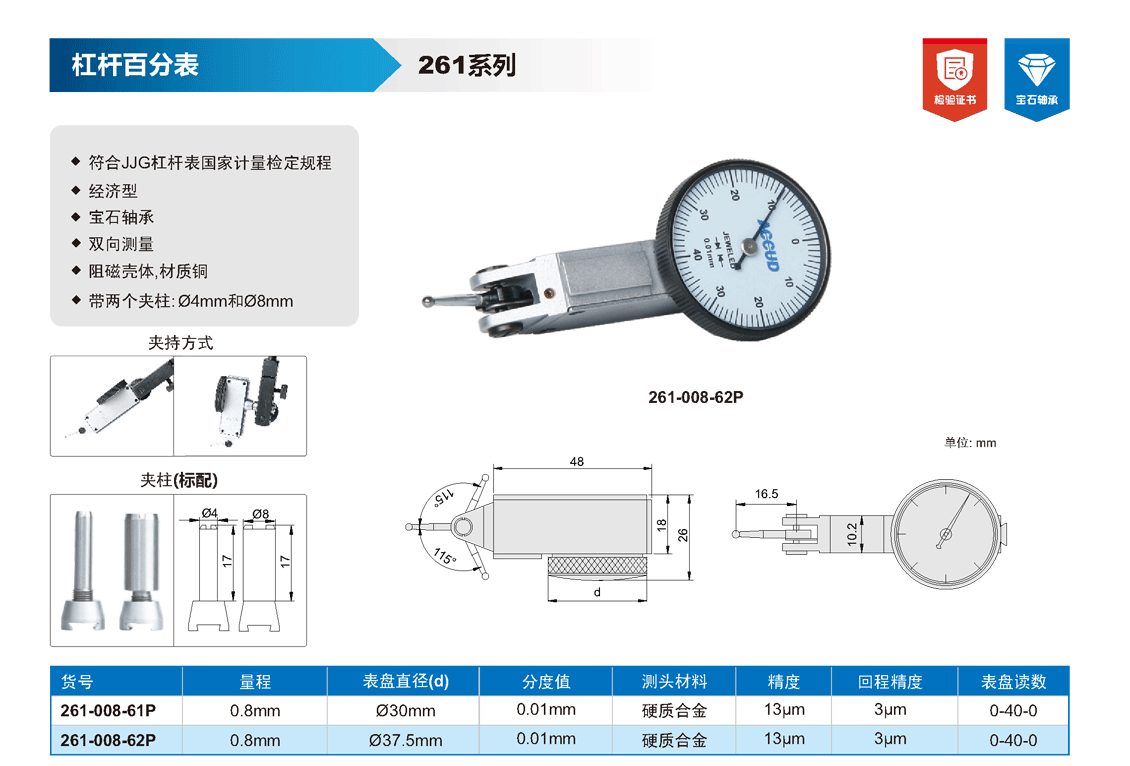 簡短描述: ? 符合JJG杠桿表國家計(jì)量檢定規(guī)程 ? 經(jīng)濟(jì)型 ? 寶石軸承 ? 雙向測量 ? 阻磁殼體,材質(zhì)銅 ? 帶兩個(gè)夾柱: ?4mm和?8mm