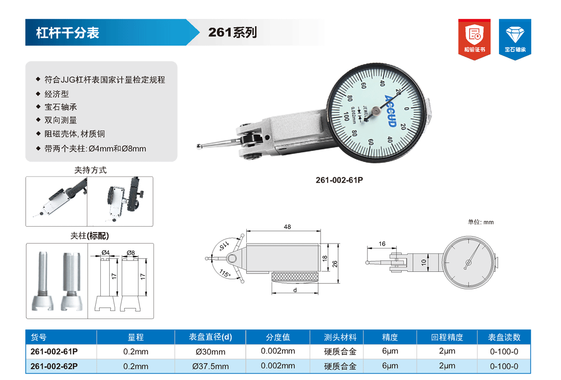 簡(jiǎn)短描述: ? 符合JJG杠桿表國(guó)家計(jì)量檢定規(guī)程 ? 經(jīng)濟(jì)型 ? 寶石軸承 ? 雙向測(cè)量 ? 阻磁殼體, 材質(zhì)銅 ? 帶兩個(gè)夾柱: ?4mm和?8mm