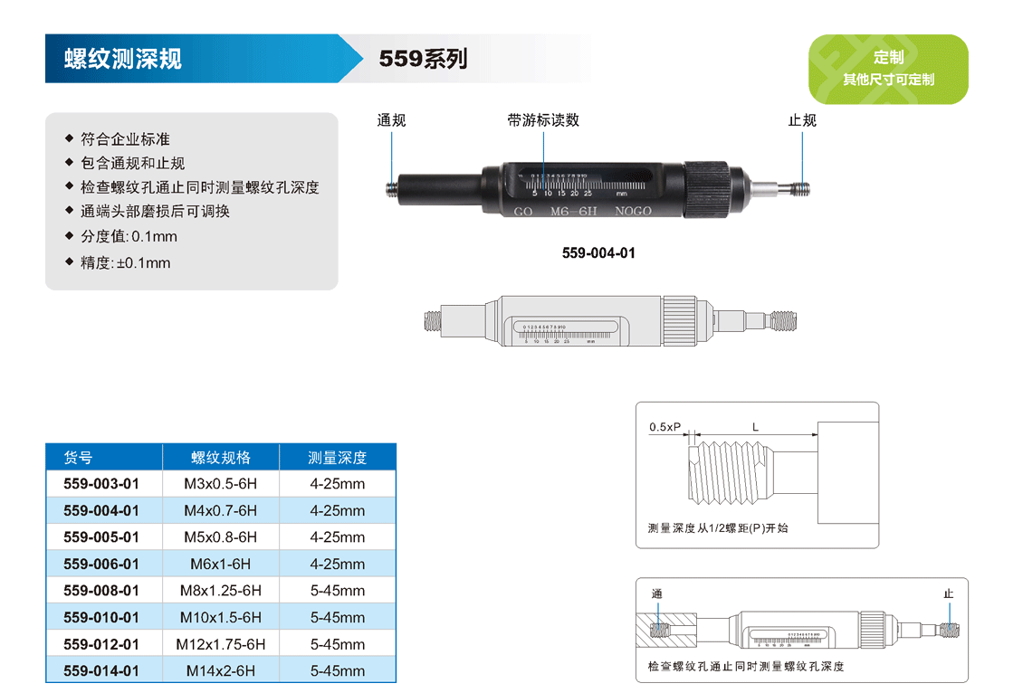 簡短描述: ? 符合企業(yè)標(biāo)準(zhǔn) ? 包含通規(guī)和止規(guī) ? 檢查螺紋孔通止同時測量螺紋孔深度 ? 通端頭部磨損后可調(diào)換 ? 分度值: 0.1mm ? 精度: ±0.1mm